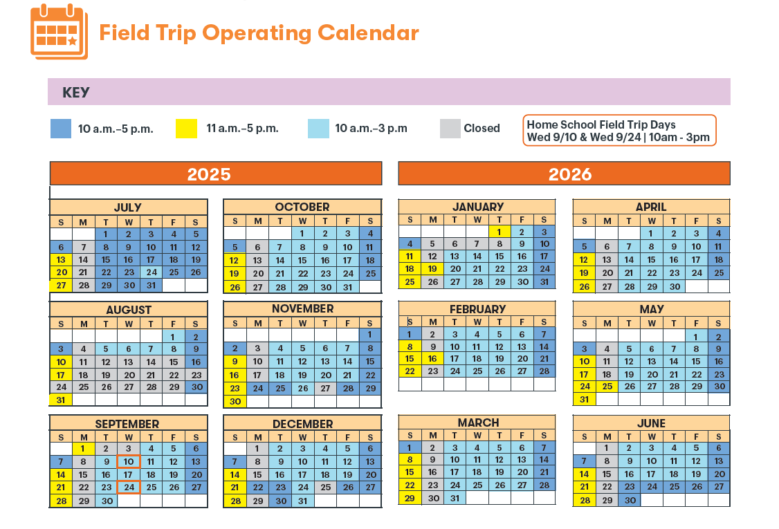 School field trips available Sept. 4, 2025 - June 5, 2026. Summer 2025 field trips available June 10, 2025 - Aug. 8, 2025.
